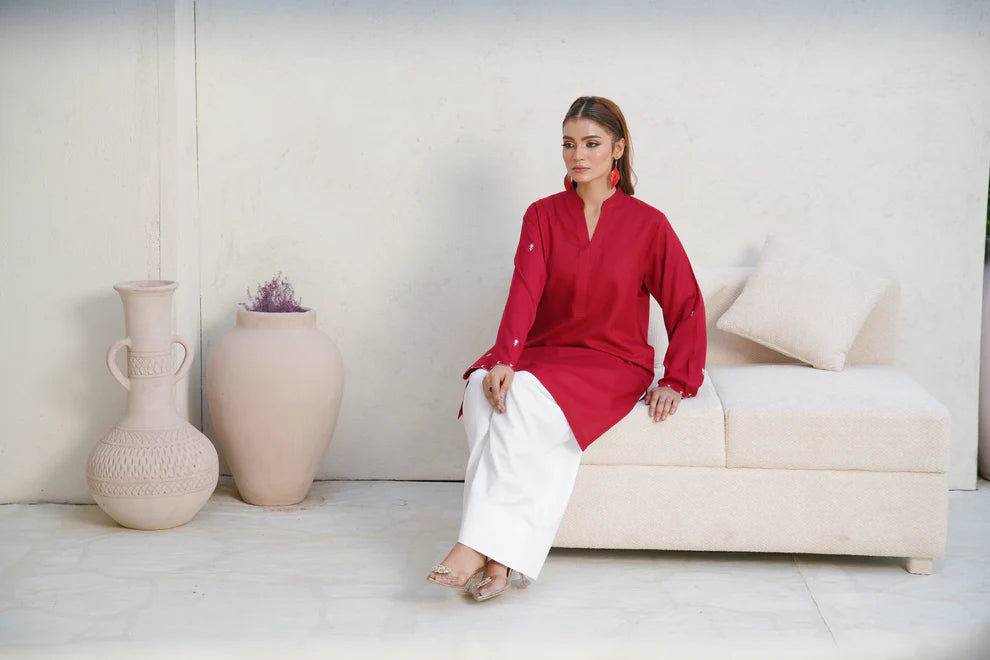 Presenting a stunning reddish maroon creation that boasts beautiful patterns all over the shirt. The scalloped edges with cutwork design adds to the intricacy of this outfit. Embrace the timeless allure of this gorgeous outfit that is a true staple for your winter wardrobe
