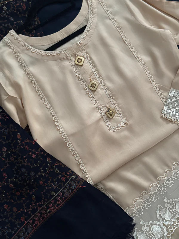 This two-piece linen set, featuring delicate lace detailing, makes the perfect winter outfit. It’s paired with stylish trousers.