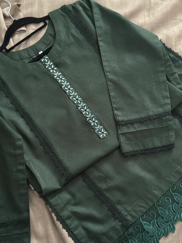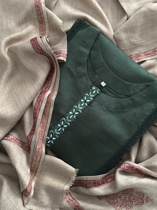This two-piece khaddar set, featuring delicate lace detailing, makes the perfect winter outfit. It’s paired with stylish palazzo trousers.