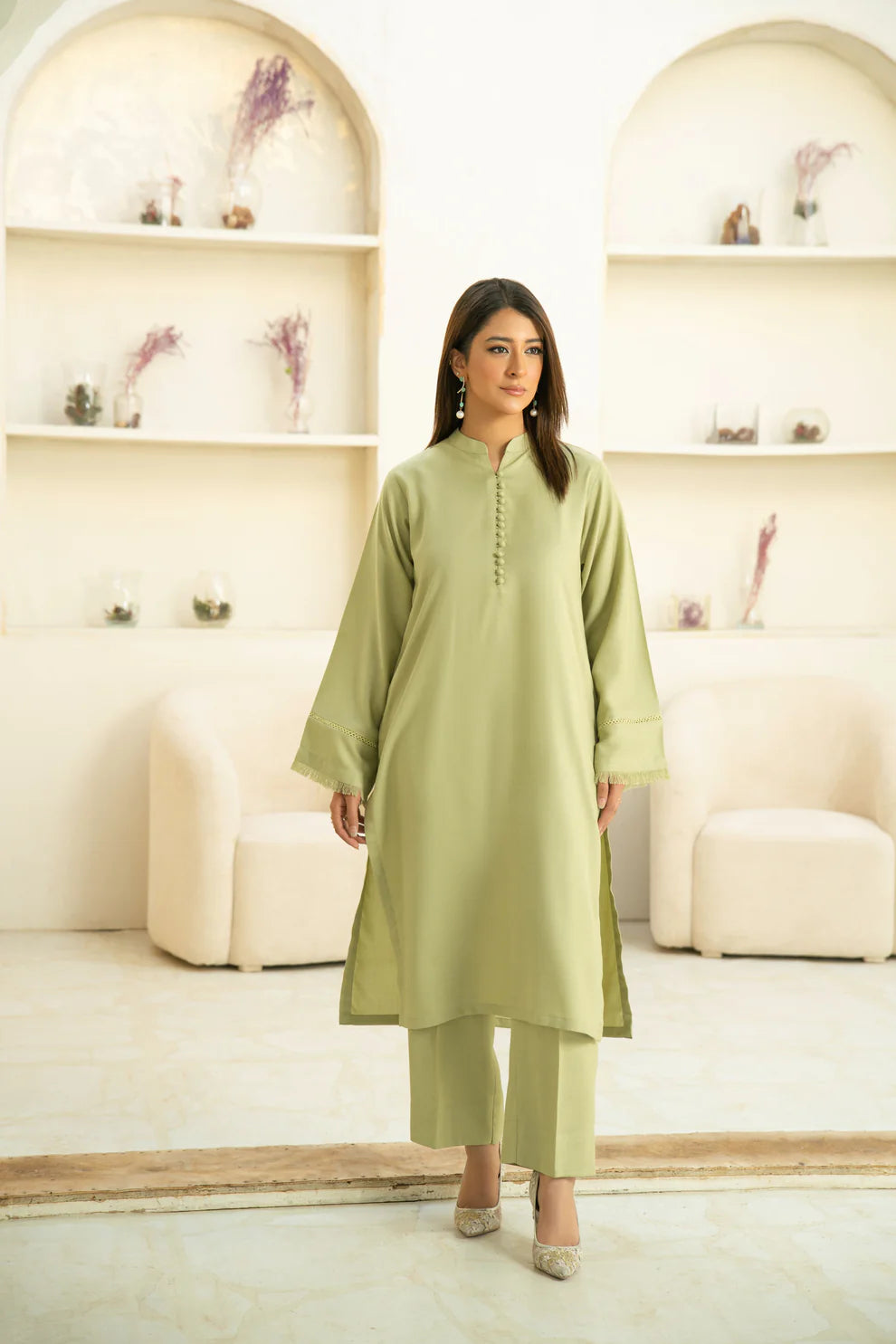 Step into elegance with our delicate pastel green buttoned kurta, paired with classic trouser for a timeless look. Perfect for any occasion, this outfit brings sophistication and charm to your wardrobe.