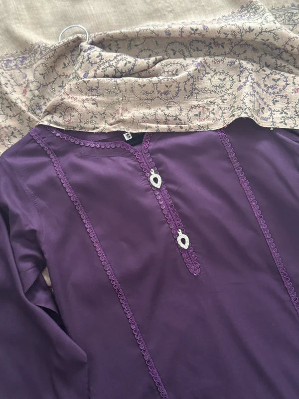 This two-piece linen set, featuring delicate lace detailing, makes the perfect winter outfit. It’s paired with stylish plazo.